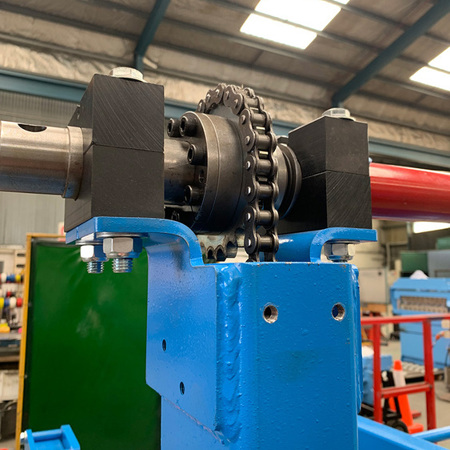 Pneumatically operated drop arms support the steel rollers that support the sheet until it clears the machine. The drop arms will cycle automatically after each cut via pneumatic cylinders and drop sheets onto a stack without operator intervention.