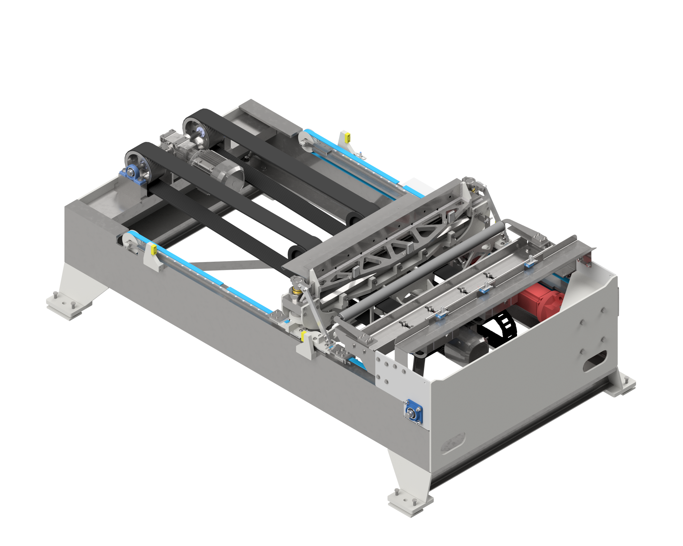 The Flying Shear is capable of a minimum sheet length of 1.8m at a 60m per/minute (200ft per/minute) line speed, which is accomplished by a servo motor/drive combination. This allows the shear to match speed with the outgoing sheet before cutting. The flying shear is mounted on an extended chassis utilizing a linear bearing track. It is supported by a carriage and powered by an electric motor and linkage system.