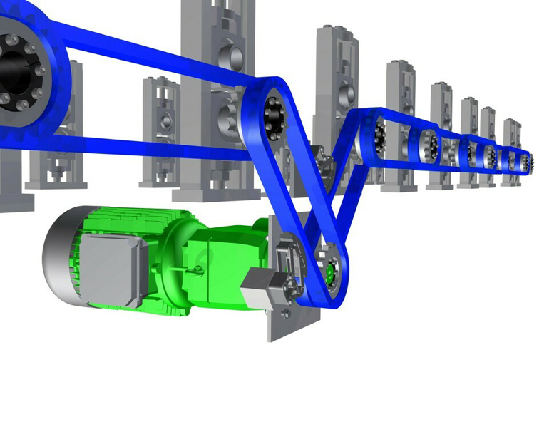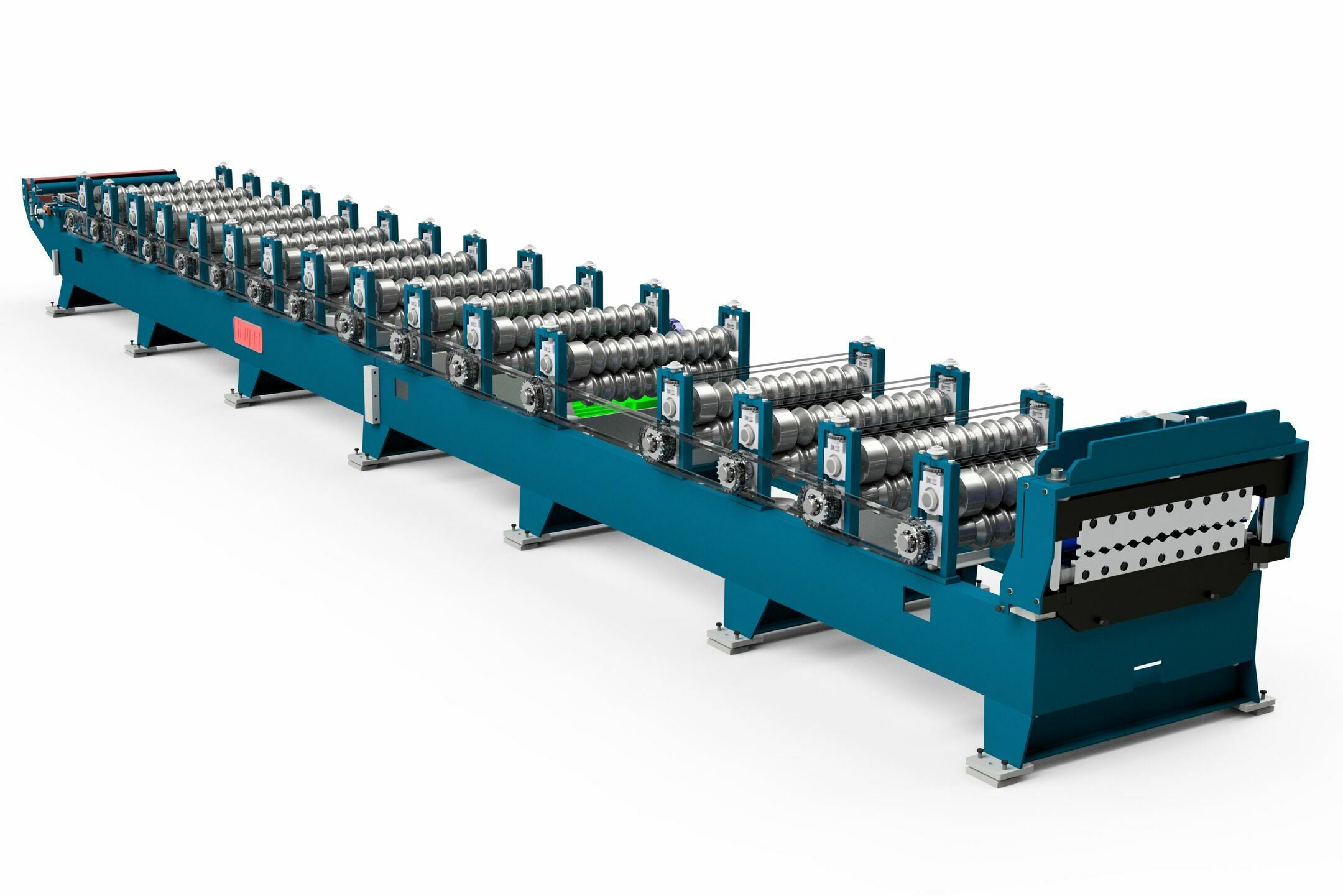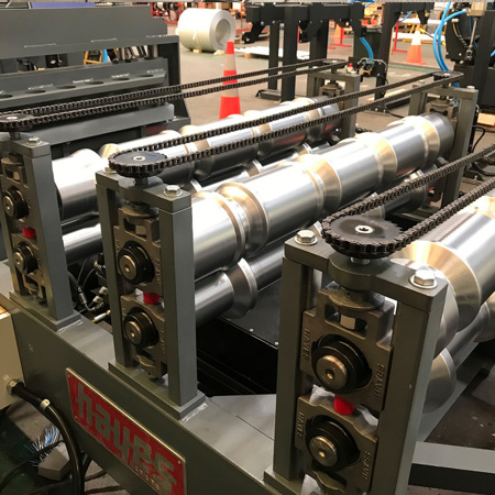 - Each bottom roll of tooling is driven, with first stations coupled via spur gear to aid traction.