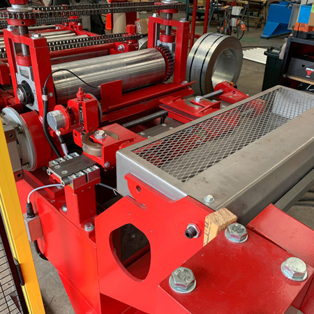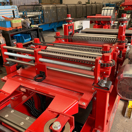 - Primary strip feed rolls machined from hardened 4340 steel rolls spur gear coupled and fitted with chain-coupled pressure screws to adjust traction.