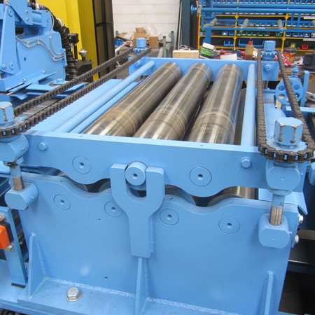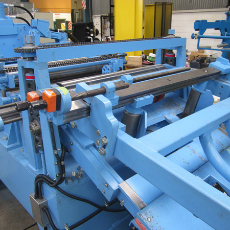 - Primary strip feed rolls machined from hardened 4340 steel rolls spur gear coupled and fitted with chain-coupled pressure screws to adjust traction.